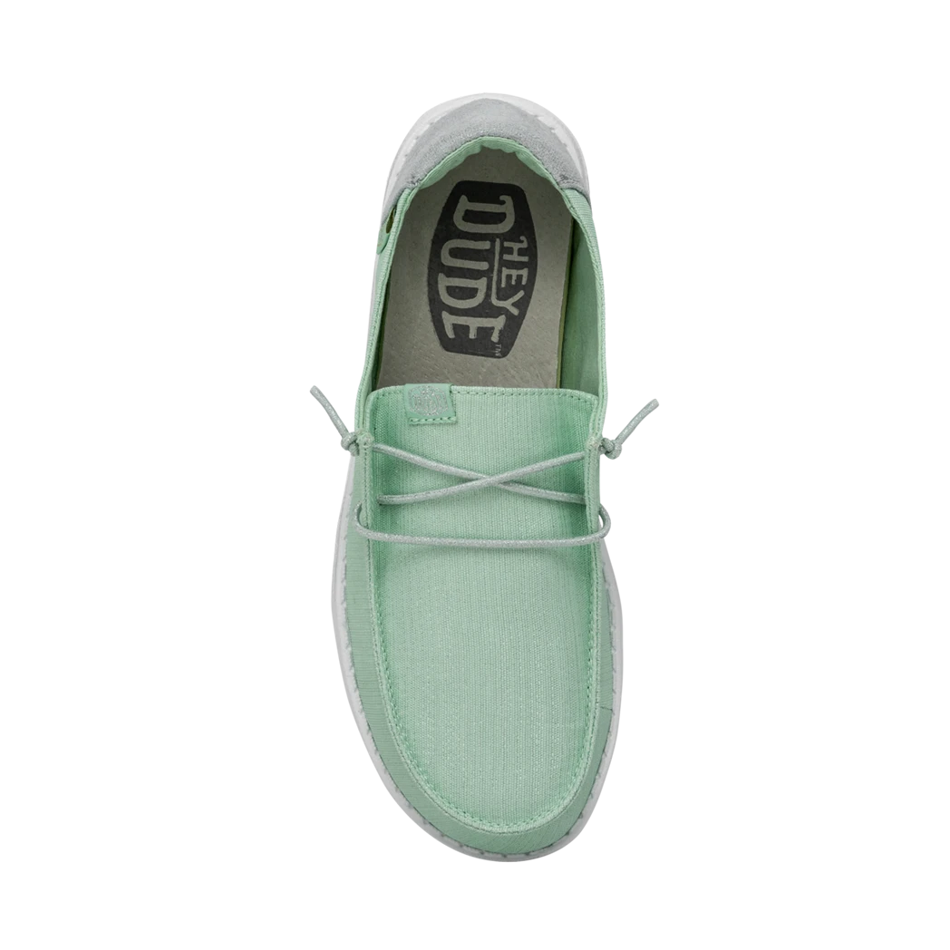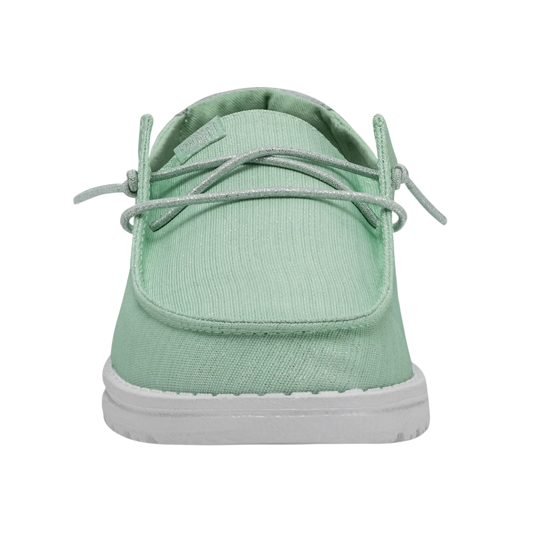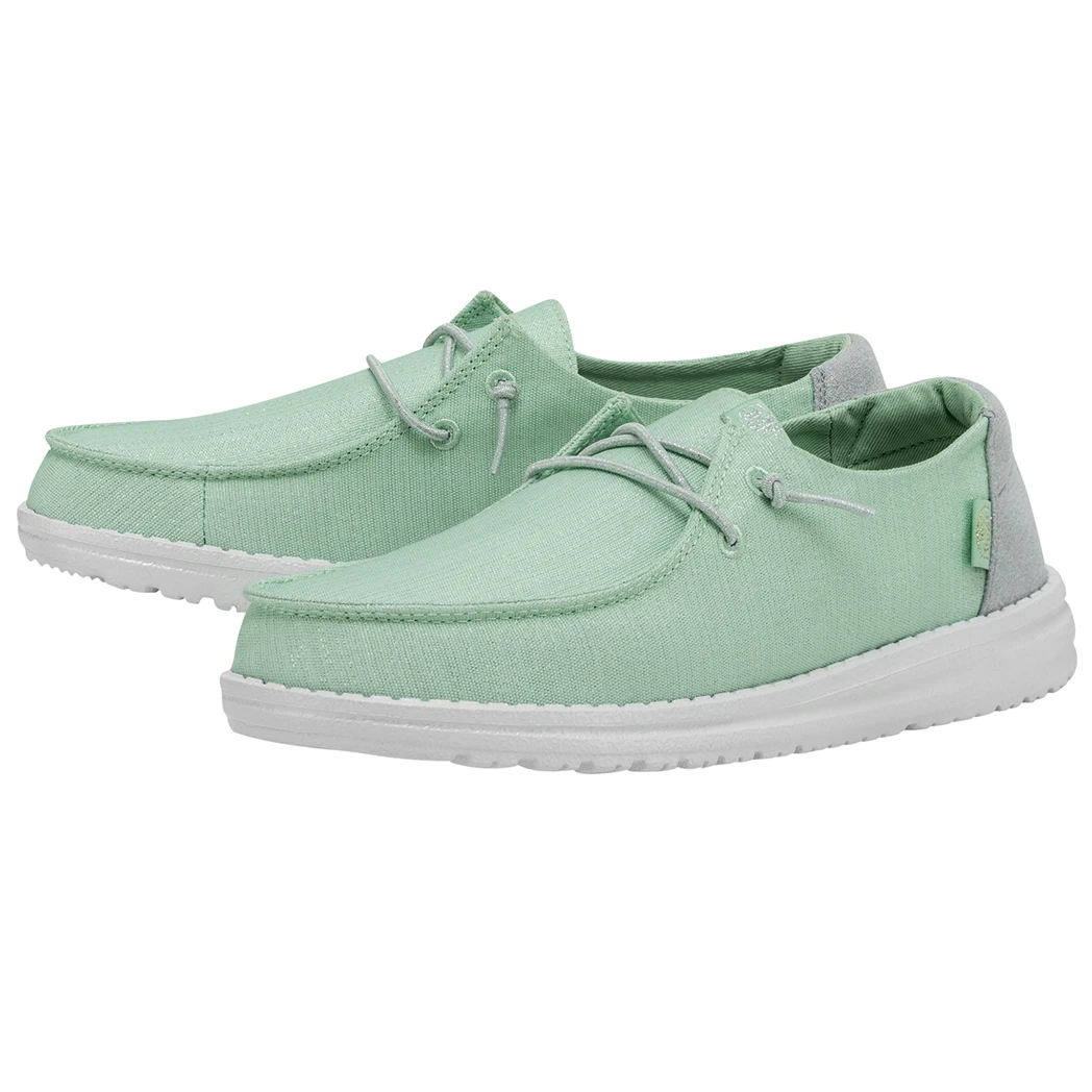 The Hey Dude Wendy Glitter Moon Stone is made to shine! It’s perfect for spring and summer. It features a durable, metallic textile upper in front of a fun glittery heel. It features an extra layer of foam cushion, is lined with a light cotton-blend lining for lustrous strides. This shoe features the ultralight outsole with our easy-on, elastic lacing system, you can count on comfort without lacking style!Â
