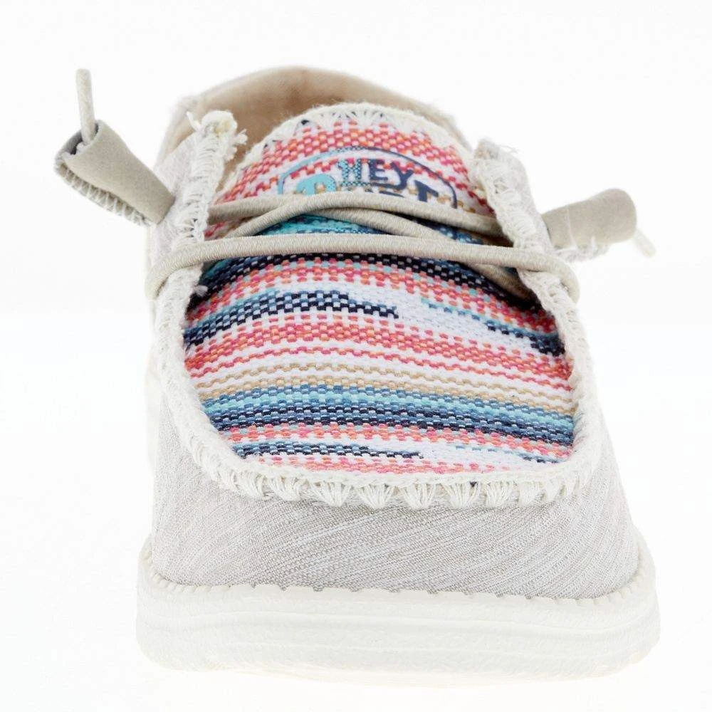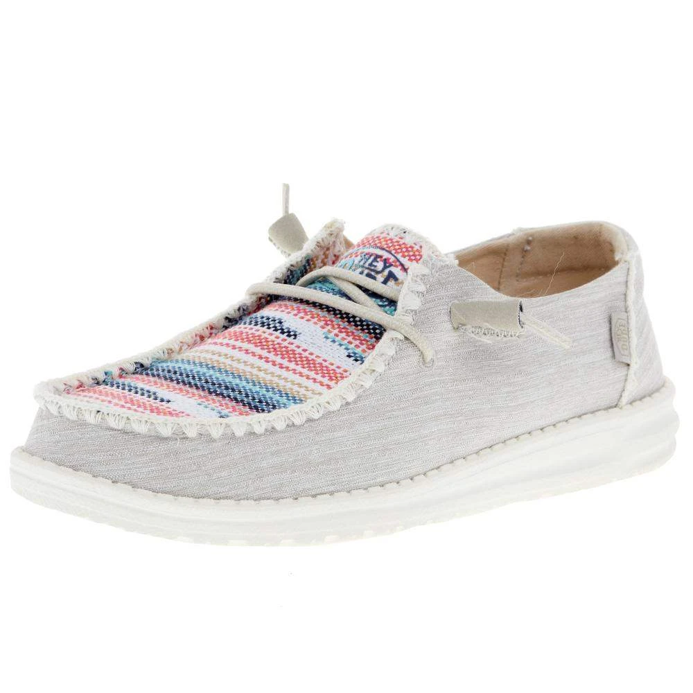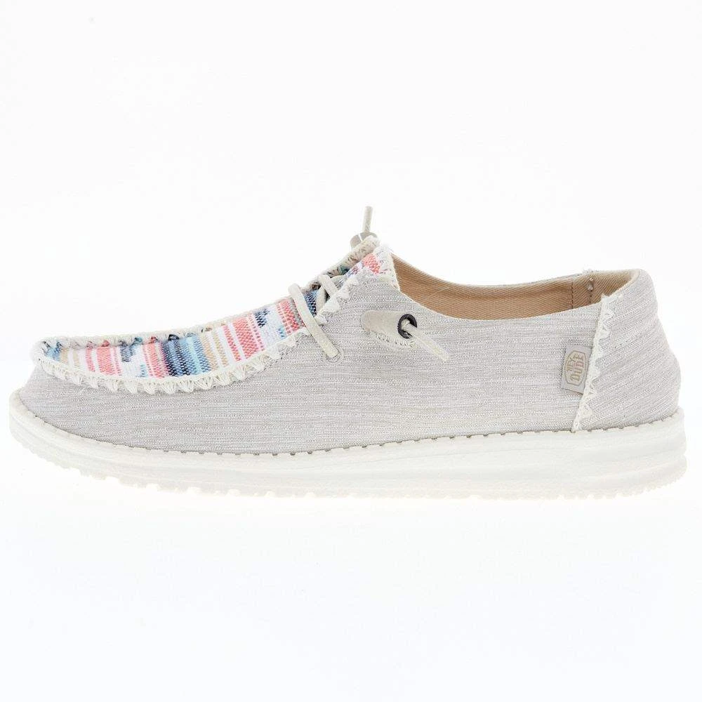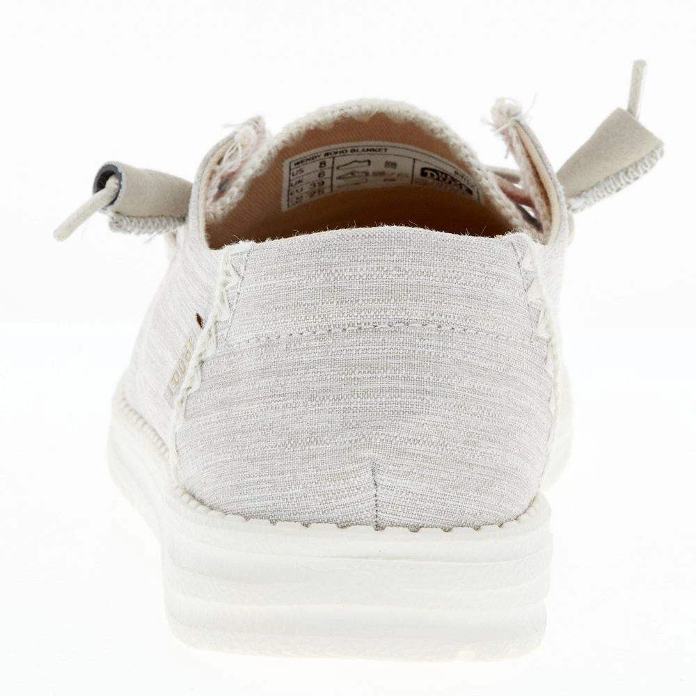 Wendy Boho Blanket collection – classic, cool, vintage. Crochet stitching and patterned chambray-woven fabrics uppers come together with all the breathability, durability, and cloud-like HEYDUDE comfort your feet expect. Lined with a light and care-free cotton lining for strides just as easy-going and finished off on an ultralight outsole with no-tie, elastic laces.