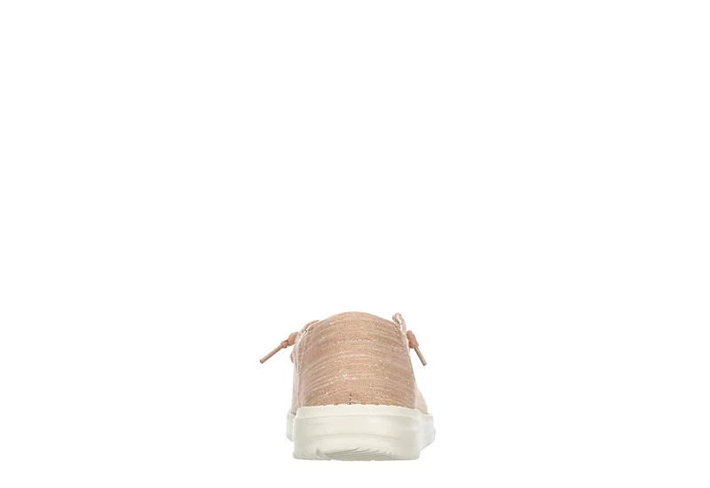 Relax into your passion with the HEYDUDE Wendy Sparkling women’s slip-on sneaker. With a cotton-blend canvas upper featuring shimmer details for added style and cotton laces for a secure fit, this slip-on sneaker is machine washable for easy maintenance. The removable Memory Foam insole and leather lining offer ergonomic comfort and cushioning, while the ultralight outsole lets you explore unfettered.